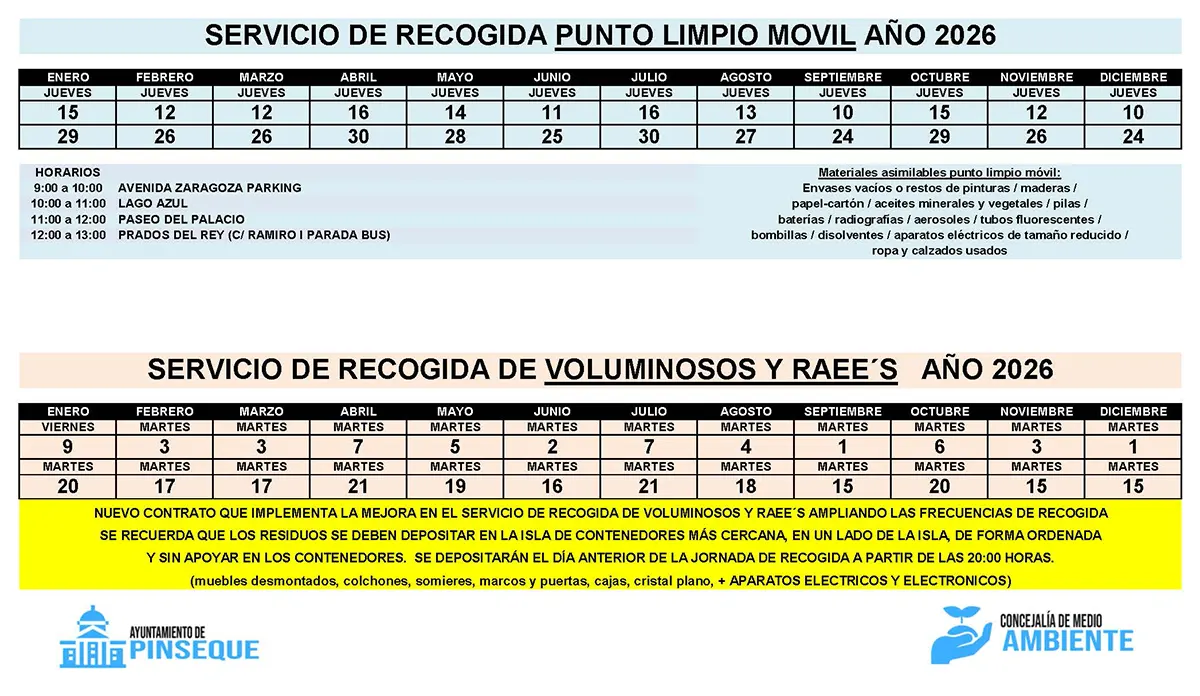 El punto limpio de Pinseque se encuentra en C/Las Eras, 4, y está abierto los lunes, miércoles y viernes laborables de 16 a 18 h.